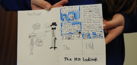 The actual historical knowledge the children researched through different means and sources. In two schools so far the entire class focused on place related incidents, i.e. The Lockout of 1913 in Haddington Rd Dublin, The Clones Shooting in 1922 (in which the newly established border plays a big part), and the arrival of the Belgian Refugees in Monaghan, Carrickmacross. In preparing these stories for publication, children, teacher, artist and writer worked together to tell the story orally, writer transcribed, we revisited the story for accuracy, completeness, further details and context. Once agreement had been reached on the written story, the children selected the images or aspects of the story they wanted to illustrate. This kind of collective working meant both a higher level of knowledge was attained, and shared, and that a high level of ownership of both text and illustrations was reached. The role of the adults was to support the children in their line of inquiry, rather than leading the children in any particular direction.