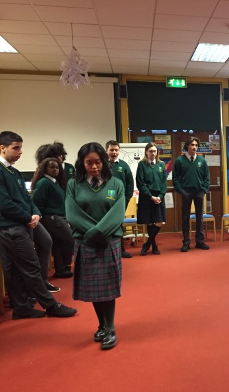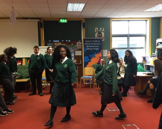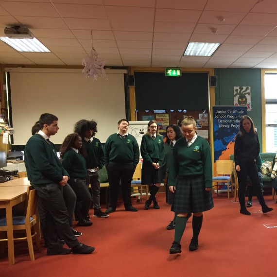 Aiobheann and Phil then returned do the schools for a two hour long post show workshop that built on the previously introduced techniques of statues, tableaux and walking in character to explore how both the characters and the students themselves had changed over the course of the evening.