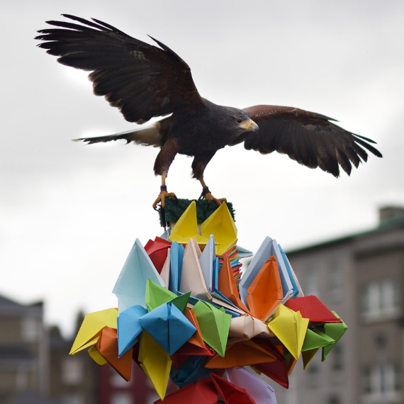 The residency began with pupils visiting Maria in her TBG+S Studio to see where she works, and get an insight into her methods, motivations and inspirations as an artist. From there, Maria began an enquiry into birds of prey with the children, through various exercises in drawing, origami, movement/performance and inhabiting the psyche of the bird. This developed into creating a collaborative sculptural piece which functioned as a bird stand, for the Harris hawk, Kayla, to land on. A final photograph was taken by Maria to document this process. The pupils were extremely open and inquisitive about the hawks and worked really hard to make the origami pieces which made up the base for the sculpture. All the school staff were very encouraging and accommodating throughout the residency.
