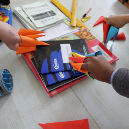 The following sessions in the school consisted of teaching the boys how to make claws and beaks with paper and origami. It was well timed around Halloween so the boys could re-appropriate the claws for scary costumes. The teachers would help the boys make them, though once they had gone through the process a couple of times they needed no more help and could make loads.