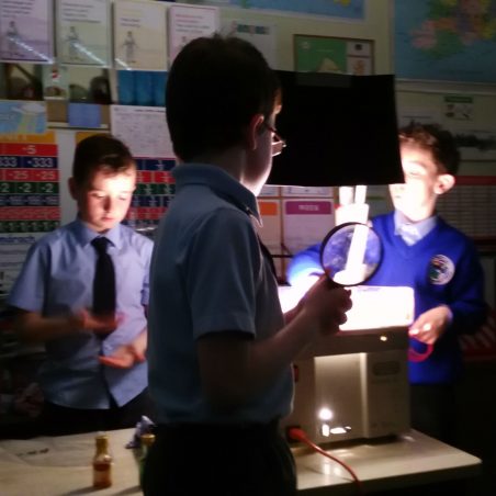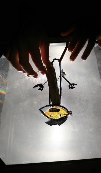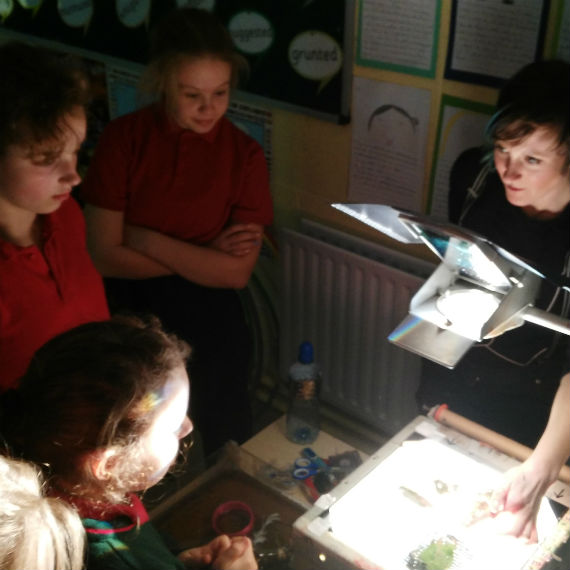 The teacher allowed Robbie and Annie to bring the children around the school grounds to examine and collect, in pairs, any objects they found of interest. These objects were then projected through the use of an analog overhead projector and discussed openly and collectively on how their appearances changed with our changing perceptions. This example facilitates a validation process for the individual in what they later view as art and how it can then be manipulated and viewed to help create a story.